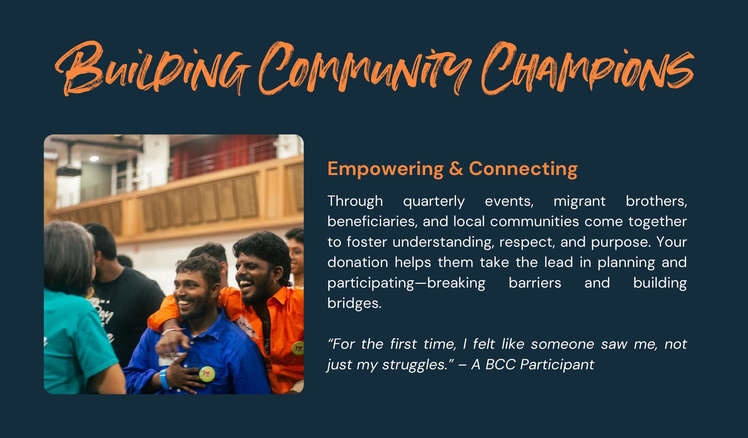 🟠Community Building: Working alongside corporates, NGOs, ground-up groups and government agencies to mobilise resources, co-design initiatives, and extend help to groups excluded from conventional support. These partnerships allow us to amplify impact and address gaps more holistically.